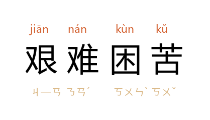 引清 李渔 《巧团圆·书帕》:“怎奈爹爹过于详慎,定要把艰难困苦之事试过几桩,纔与他完姻缔好。”《歧路灯》第八六回:“这日子穷了,受过了艰难困苦,也就渐渐的明白过来。”毛泽东 《为建设一个伟大的社会主义国家而奋斗》:“我们有充分的信心,克服一切艰难困苦,将我国建设成为一个伟大的社会主义共和国。”