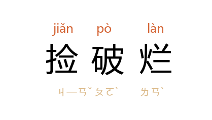 ⒉ 泛指拾取别人不要的事物。也作「拣破烂」。