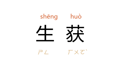引《汉书·曹参传》:“﹝ 参 ﹞击 魏王 於 曲阳,追至 东垣,生获 魏王 豹。”宋 文天祥 《将军王安节》诗序:“常州 败,虏生获 王安节,不屈而死。”郭希仁 《从戎纪略》:“又闻 甘 军生获我军,置火药於心窝轰之毙。”