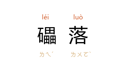 ⒈ 亦作“礌落”。错落分明貌。引申为光明正大、直率开朗的样子。