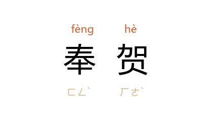 引《后汉书·桓荣传》:“永平 十五年,入授皇太子经,迁越骑校尉,詔勑太子、诸王各奉贺致礼。”唐 元稹 《故中书令赠太尉沂国公墓志铭》:“魏 之人,老者闻见平时多出涕,少者不知所以然,百辟、四方皆奉贺。”《儒林外史》第二八回:“三位道:‘我们一定奉贺。’”