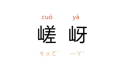 引明 王世贞 《过故陆虞郭第有感》诗:“此梅十亩阴,老龙吐嵯岈。”清 严如熤 《三省边防要览》卷十四:“﹝ 兴安 一府﹞各要阨,皆怪石嵯岈,谷深山阻,号称天险。”《人民文学》1979年第2期:“站在这一式三台七米多高的卷取机下举目仰视,只见钢铁嵯岈,齿盘交错。”