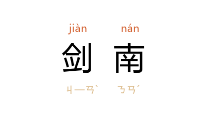 ⒈ 地名。唐贞观时所设十道之一。因位在剑阁之南,故称为「剑南」。包括今四川省剑阁以南,大江以北,甘肃省蟠冢山以南及云南省东北边境等地。