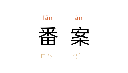 引元 李致远 《还牢末》楔子:“如今相公问你呵,你只説误伤人命,不该死罪,我就好番案了。”明 刘基 《前江淮都转运盐使宋公政绩记》:“﹝ 宋公 ﹞至督有司掩捕,获其渠魁,鞠间尽得其党……即为番案,悉出其囚。”