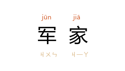 引《晋书·食货志》:“人心所见既不同,利害之情又有异。军家之与郡县,士大夫之与百姓,其意莫有同者。”唐 刘禹锡 《马嵬行》:“军家诛佞倖,天子捨妖姬。”京剧《取南郡》第一场:“军家胜败原难定,到底 周郎 善用兵。”