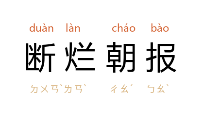 ⒈ 断烂,残缺陈腐。朝报,朝廷的公报,传抄皇帝诏令和官员章奏之类。王安石戏称《春秋经》只有简略要闻而缺乏事情的原委本末,如同断烂朝报。见《宋史·卷三二七·王安石传》。后指陈腐杂乱,缺少价值的记载。