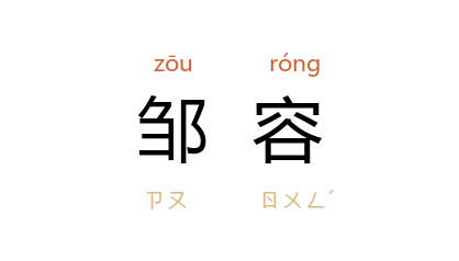 ⒈ (1885-1905)近代民主革命烈士。四川巴县(今属重庆市)人。1902年留学日本,参加反清活动。次年回国,在上海写成《革命军》,宣传革命,号召推翻清朝统治,建立中华共和国。苏报案发生后,被判刑。后病死狱中,年仅二十岁。有《邹容文集》。