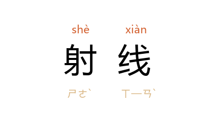 ⒈ 波长较短的电磁波,包括红外线、可见光、紫外线、爱克斯射线、丙种射线等。速度高、能量大的粒子流亦称射线,如甲种射线、乙种射线和阴极射线等。