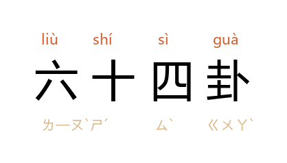 ⒈ 八卦重叠后所组成的六十四卦。由原本三爻变成六爻,如☰和☰相重叠成䷀。六十四卦各有卦名,有干、坤、屯、蒙、需、讼、师、比、小畜、履、泰、否、同人、大有、谦、豫、随、蛊、临、观、噬嗑、贲、剥、复、无妄、大畜、颐、大过、坎、离、咸、恒、遯、大壮、晋、明夷、家人、睽、蹇、解、损、益、夬、姤、萃、升、困、井、革、鼎、震、艮、渐、归妹、丰、旅、巽、兑、涣、节、中孚、小过、既济、未济等六十四卦。