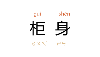 引《京本通俗小说·碾玉观音》:“一路尾着 崔寧 到家,正见 秀秀 坐在柜身子里。”《水浒传》第二九回:“郑屠 正在门前柜身内坐定,看那十来箇刀手卖肉…… 武松 看了,矁着醉眼,逕逩入酒店里来,便去柜身相对一副座头上坐了。”