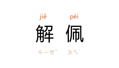 ⒉ 相传郑交甫到汉皋台下游玩时,遇见二仙女,解珮相赠后忽不见。见汉·刘向《列仙传·卷上·江妃二女》。后遂以解佩为男女情爱期许之表征。宋·欧阳修〈玉楼春·燕鸿过后春归去〉词:「闻琴解佩神仙侣,挽断罗衣留不住。」也作「解珮」。