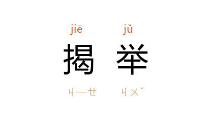 引郭沫若 《历史人物·屈原研究》:“我们且把他所称道的‘前王’和‘前圣’索性开一个清单在下面吧……以上一共揭举了十六项,还有些次一等的贤人我没有举出。”王西彦 《夜宴》五:“接任后第一次向学生训话,他就用慷慨激昂的语调揭举了三章约法。”