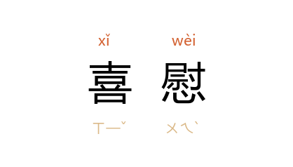 引南朝 陈 徐陵 《为贞阳侯重与王太尉书》:“程婴 之义,自古为难; 荀息 之忠,良以喜慰。”宋 苏轼 《与毛泽民推官书》之一:“居夷久矣,不意復闻韶濩之餘音,喜慰之极。”《水浒传》第一〇八回:“宋江 亏神医 安道全 疗治,病势已减了六七分, 卢俊义 等甚是喜慰。”吴组缃 《山洪》二一:“有的忍着喜慰的笑,嘴也抿不拢来。”