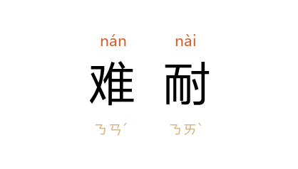 引《隋书·裴蕴传》:“老革多姦,将贼胁我。欲搭其口,但隐忍之,诚极难耐。”《新五代史·汉臣传·史弘肇》:“弘肇 不喜宾客,尝言:‘文人难耐,呼我为卒。’”王愿坚 《普通劳动者》:“六月中旬的天气已经够热了,这下午三四点钟时分,更是一天里最难耐的时候。”