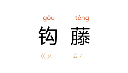⒈ 植物名。茜草科。常绿攀援状灌木,小枝四方形。叶对生,椭圆形。通常在叶腋处生有由花序柄变成的弯钩两枚,故名。中医学上以带钩的茎枝入药,以治眩晕头痛、小儿惊风、高血压等症。见明李时珍《本草纲目·草七·钩藤》。