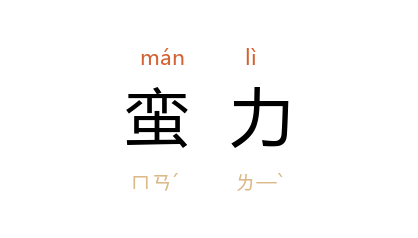 引明 袁宏道 《竹枝词》:“拽时蛮力强三虎,抛掷轻如一鸟毛。”《儿女英雄传》第四十回:“其中有膀子蛮力的,不去靠弓马干功名,偏喜作个山闯子,流为强盗。”郭沫若 《屈原考》:“项羽 一身蛮力,终于上了 刘邦 的当。”