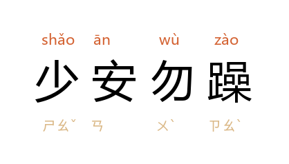 ⒈ 少:稍微,暂时;安:徐缓,不急;勿:不要;躁:急躁。暂且安心等一会儿,不要急躁。