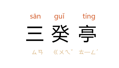 ⒈  亭名。唐大历八年,湖州刺史颜真卿于浙江乌程杼山为处士陆羽所建。成于癸丑年、癸卯月、癸亥日,故名。