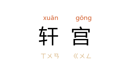 引隋 李播 《周天大象赋》:“广邦缴而斯留,復轩宫而载出。”《文选·谢庄<月赋>》:“增华台室,扬采轩宫。”李善 注:“轩宫,轩辕之宫……《淮南子》曰:‘轩辕者,帝妃之舍。’ 高诱 曰:‘轩辕,星名。’”