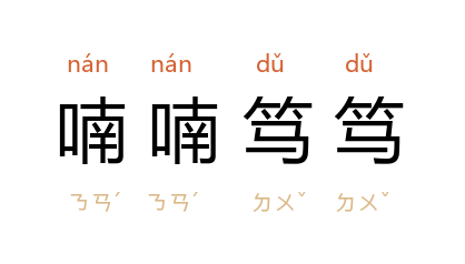 引元 杨显之 《潇湘雨》第四折:“虽然是被风雨淋淋渌渌,也不合故意的喃喃篤篤。”《水浒传》第八回:“薛霸 一路上喃喃咄咄的口里埋寃叫苦。”