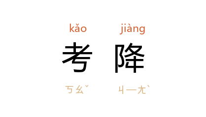 ⒈ 升降。《仪礼·士丧礼》:“哀子某,来日某卜葬其父某甫,考降无有近悔?”郑玄注:“考,登也;降,下也。言卜日葬魂神上下,得无近于咎悔者乎。”一说,谓父亡故。