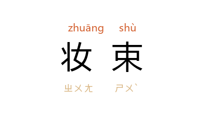 ⒉ 犹服饰。 明 胡应麟 《少室山房笔丛·庄岳委谈下》:“当时优家者流,粧束因可概见,而后世所为副净等色,有自来矣。