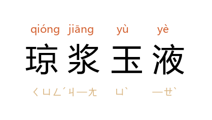 引《孤本元明杂剧·赛娇客·第三折》:「我这里高捧著琼浆玉液,他那里低唱著梁州第七。」《孽海花·第一〇回》:「忽然一滴杨枝水,劈头洒将来,正如仙露明珠,琼浆玉液,那一个不欢喜赞叹。」