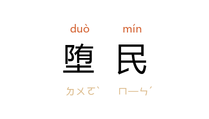 ⒈ 称惰民。绍兴也叫“乐户”。元灭南宋后,将俘虏和罪犯集中于绍兴等地,称之为“怯怜户”;明编户籍,统称为“丐户”,或为后世“堕民”来源之一。又相传宋将焦光瓒率部降金,宋人引以为耻,乃贬其部卒之籍,称为“堕民”。或谓指明初张士诚、方国珍的部属。数百年来被视为“贱民”的一种,不许与一般平民通婚,不许应科举,多任婚丧喜庆的杂役等事。清雍正时削籍,与平民同列。但与其他居民的界线,解放后才完全消失。