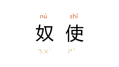 引清 唐甄 《潜书·贱奴》:“儿畜公卿,奴使百司,狗奔将帅,天子孤矣。”鲁迅 《坟·灯下漫笔》:“并且因为自己各有奴使别人,吃掉别人的希望,便也就忘却自己同有被奴使被吃掉的将来。”老舍 《四世同堂》四一:“他们多少听说过 日本 人怎样灭了 朝鲜,怎样夺去 台湾,和怎样虐待奴使 高丽 与 台湾 人。”
