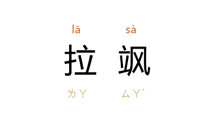 引《晋书·五行志中》:“孝武帝 太元 末, 京口 謡曰:‘黄雌鸡,莫作雄父啼。一旦去毛衣,衣被拉颯栖。’寻而 王恭 起兵诛 王国宝,旋为 刘牢之 所败,故言‘拉颯栖’也。”金 元好问 《游龙山》诗:“恶木拉颯栖,直干比指稠。”清 翟灏 《通俗编·状貌》:“拉颯,言秽杂也。”