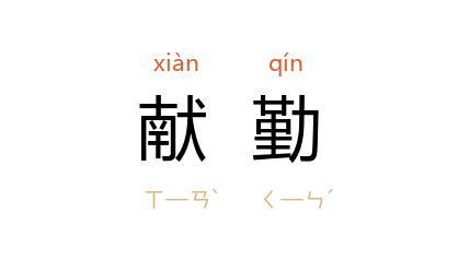 引《西游记·第三四回》:「你们来怎的?我往自家儿子去处,愁那里没人伏侍,要你们献勤塌嘴?都回去!」《荡寇志·第四回》:「高俅必不能料得,不知是那个献勤。」