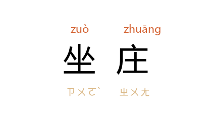 ⒉ 在牌戏或赌博中做庄家。如:现在又轮到他坐庄了!
