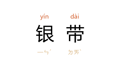 引南朝 梁元帝 《和弹筝人》之一:“旧柱未移处,银带手轻持。”《宋史·舆服志五》:“虽升朝着緑者,公服上不得繫银带。”清 唐孙华 《偕夏重至国学观古槐》诗:“推排列拜皆新贵,乌纱银带纷趋蹌。”