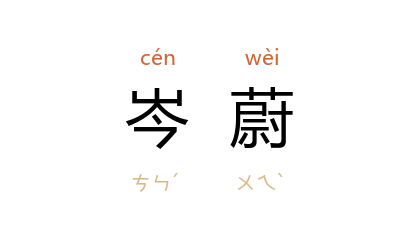 引《礼记·大学》“《诗》云:緡蛮黄鸟,止於丘隅” 汉 郑玄 注:“鸟择岑蔚安閒而止处之耳。”《新唐书·吐蕃传下》:“兰州 地皆秔稻,桃李榆柳岑嶎。”宋 王安石 《游章义寺》诗:“拂榻寄午梦,起寻北山椒。岑嶎鸟絶迹,悲鸣唯一蜩。”宋 范成大 《吴船录》卷上:“飞湍奔雪,奔出桥外,则入岑蔚中。”