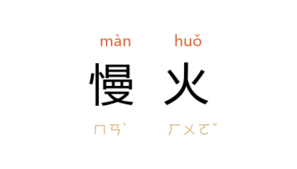 引唐·王建〈隐者居〉诗:「何物中长食?胡麻慢火熬。」《朱子语类·卷五九·孟子·告子上》:「如煎药,初用猛火,既沸之后,方用慢火养之。」