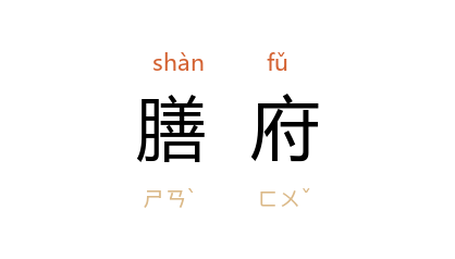 引《周礼·地官·廛人》:“凡珍异之有滞者,歛而入於膳府。”《魏书·食货志》:“又於岁时取鸟兽之登於俎用者,以牣膳府。”前蜀 韦庄 《和郑拾遗秋日感事》:“八珍罗膳府,五采鬭筐牀。”
