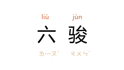 ⒈ 唐太宗征战时所骑过的六匹骏马:拳毛騧、什伐赤、白蹄乌、特勒骠、飒露紫、青骓。贞观十一年,太宗作《六马图赞》(文见《全唐文》卷十),使欧阳询以八分体书之,刻石。欧书亡,宋游师雄重刻六碑(见《金石萃编》卷一三九)。