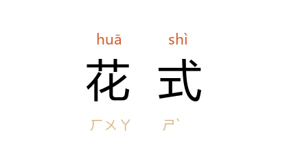 引徐迟 《“不过,好日子哪天有?”》:“大家都站在网球场上看……资格老的人就看着舞伴们的脚上的花式。”《花城》1981年第5期:“最好是女的,你不是绣得一手好花吗?不是会编织各种花式的绒衣吗?”