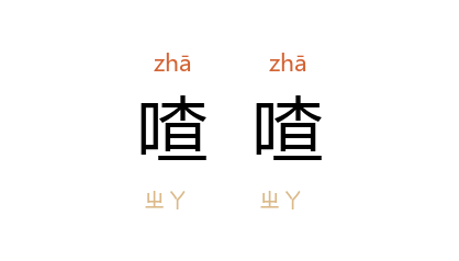 ⒈ 状声词:(1) 形容鸟噪叫声。(2) 形容高叫的声音。元·李致远元·无名氏(3) 形容低声说话的声音。。或读为「ㄔㄚ ㄔㄚ」。