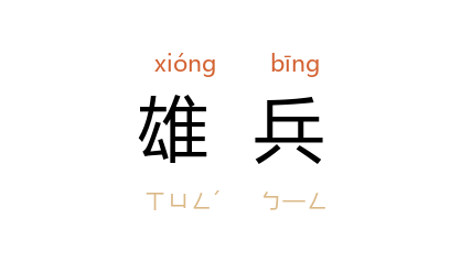 引元 关汉卿 《五侯宴》楔子:“奉命出师统雄兵,勦除草寇建功能。”《儿女英雄传》第十八回:“况他那里雄兵十万,甲士千员,猛将如云,谋臣似雨。”郭小川 《秋歌》:“看,无数战马,百万雄兵,永远向前奔行。”
