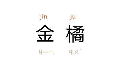 ⒈ 植物名。芸香科金柑属,低矮常绿灌木。叶为革质,互生,长椭圆形,两端均钝,长三至六公分,表面暗绿色,里面苍白色,油脂密布。花形小,白色,单立,花瓣五片。其果实也称「金橘」,球形,熟时呈金黄色,果皮厚而柔韧,不易与果肉分离。果实可生食,或加工制成果饼、蜜饯。原产于台湾及大陆地区东部、南部,日本、越南、菲律宾亦有出产。
