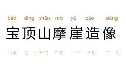 ⒈ 在四川省大足县东北宝顶山。以大佛湾、小佛湾为中心,包括广大山、龙潭、松林坡共十三处山岩。始建于南宋淳熙至淳fe7a年间,造像万余躯。有六道轮回、华严三圣、孔雀明王经变、千手观音像等巨型雕像。为全国重点文物保护单位。