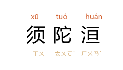 ⒈ 佛教修行者入圣道的果位之一。为声闻乘初果。证得须陀洹的人必不再投生三恶道,并且决定将会解脱轮回。须陀洹可分须陀洹向和须陀洹果。须陀洹向是指已入圣道,但还未达须陀洹果的境界。也作「预流」。