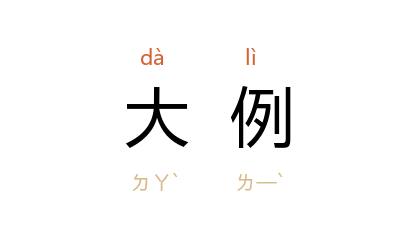 引《晋书·刘颂传》:“苟不至於害政,则皆天网之所漏;所犯在甚泰,然后王诛所必加,此举罪浅深之大例者也。”《周书·明帝纪》:“四方州镇使到,各令三日哭,哭讫,悉权辟凶服,还以素服从事,待大例除。”严复 《原强》:“欲论其合,先考其分,则昭昭若揭日月而行,亘天壤不刊之大例也。”