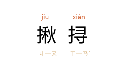 ⒈ 用手拉扯。元·睢景臣〈六国朝·长江浪险套·归塞北·么〉:「觅见银山无采取,寻著钱树不揪挦,典卖尽妆奁。」明·贾仲名也作「揪扯」。