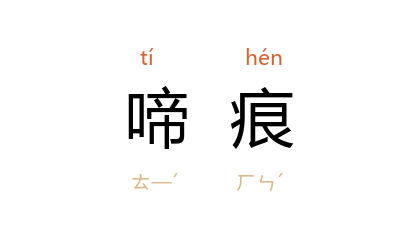 引唐·岑参〈长门怨〉诗:「绿钱侵履迹,红粉湿啼痕。」元·曾瑞〈蝶恋花·夜月楼头套〉:「别后身属新恨管,泥金翠袖啼痕满。」