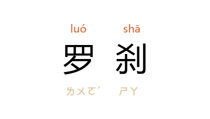 ⒈ 梵语的略译。最早见于古 印度 颂诗《梨俱吠陀》,相传原为 南亚次大陆 土著名称。自 雅 利安 人征服 印度 后,凡遇恶人恶事,皆称罗刹,遂成恶鬼名。