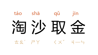 引五代 王仁裕 《开元天宝遗事·任人如市瓜》:“我朝任人如淘沙取金,剖石采玉,皆得其精粹。”亦作“淘沙得金”。 宋 刘宰 《送魏华甫侍郎谪靖州》诗:“淘沙得金遨以嬉,瘴烟不逐 岭 云西。”也用以比喻去掉坏的,得到好的。 清 李渔 《闲情偶寄·词曲下·宾白》:“凡作传奇,当於开笔之初,以至脱稿之后,隔日一删,逾月一改,始能淘沙得金,无瑕瑜互见之失矣。”
