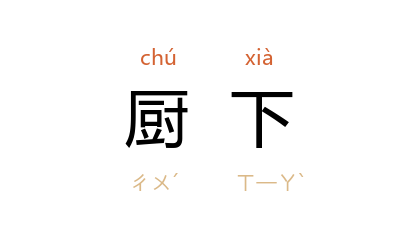 引唐·王建〈新嫁娘〉词三首之三:「三日入厨下,洗手作羹汤。」《儒林外史·第一回》:「王冕自到厨下烙了一斤面饼,炒了一盘韭菜。」