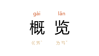 ⒈ 谓概略地观览。有时亦用作书名或文章篇名。如:郭沫若《中国古代社会研究》一书中有《中国社会之概览》一节。
